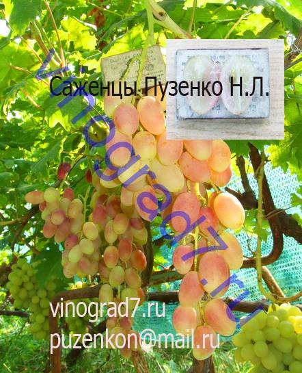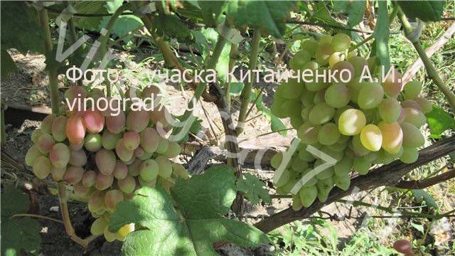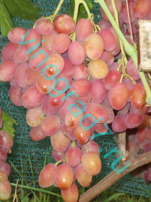 Грозди 500-900 гр без горошения с ягодами массой 10-11 гр, бочонковидной формы, мясистой. Грозди крупные, цилиндроконические, иногда бесформенные, удлиненные, рыхлые и средне рыхлые, средней массой 600-800 г. Ягоды крупные и очень крупные, средней массой 15-20г, удлиненно-овальные со слегка заостренным кончиком, бело-розовые; структура гроздей и цвет ягод похожи на сорт Кишмиш лучистый. . Мякоть плотная, хрустящая, гармоничного вкуса, кожица средней толщины. Мякоть средне плотная, приятного сортового вкуса, с несколькими тонами во вкусе. Кожица ягод средней толщины, при еде не ощущается. Сахаристость мякотиягод до 17-20% при кислотности 5-8 г/л. Урожайность ягод высокая, стабильная. Морозостойкость формы повышенная, почки в глазках выдерживают понижение температуры до -24 С. Устойчивость к милдью повышенная – 5-7 баллов, серой гнили повышенная – 5-7 баллов, оидиуму средняя – 5 баллов, филлоксере не изучалась. Характерная особенность: ранний срок созревания, очень красивая крупная товарная гроздь с высокими вкусовыми качествами ягод, одни из самых вкусных. Недостаток, с которым из-за высоких вкусовых качеств можно мириться – в отдельные годы плохое опыление и очень рыхлая гроздь.